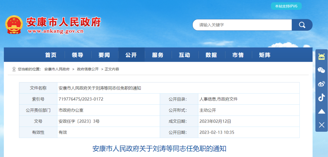 安康市人民政府关于刘涛等同志任免职的通知