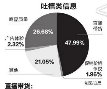 监测期间,有关“直播带货”负面信息1565203条,占吐槽类信息的47.99%。价格垄断、低俗带货、虚假宣传等问题较为突出。