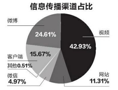 在信息传播渠道上,“消费维权”类信息传播渠道主要有视频、微博、客户端、新闻网站、微信、论坛等。其中视频信息量最高,占比42.93%;其次是微博,占比24.61%;第三是客户端,占比15.67%。