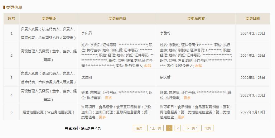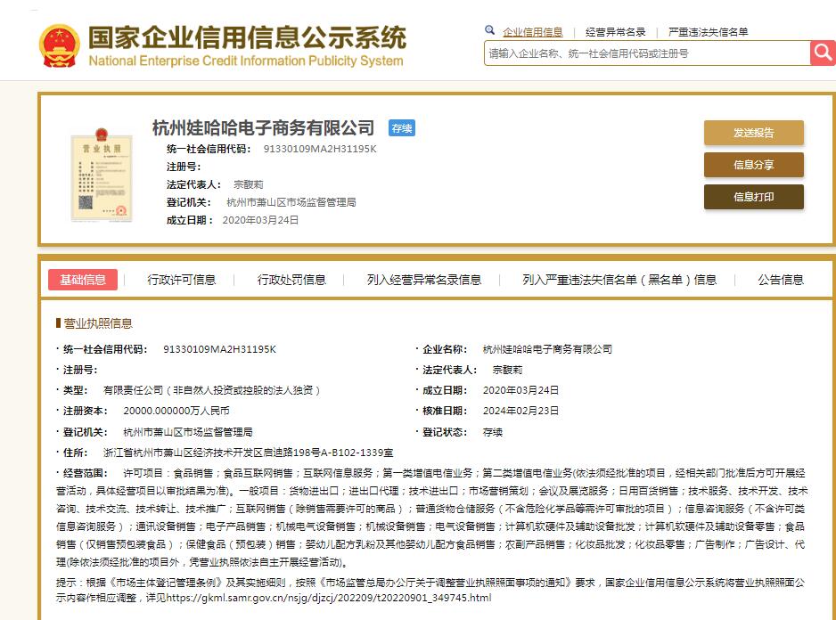 国家企业信用信息公示系统网站显示,2月23日,杭州娃哈哈电子商务有限公司发生工商变更,负责人从宗庆后变更为宗馥莉。目前,宗馥莉为杭州娃哈哈电子商务有限公司法定代表人、执行董事、经理。该公司成立于2020年3月,注册资本2亿人民币。天眼查网站显示,目前,宗馥莉共关联超百家企业,包括:巢湖娃哈哈昌盛饮料有限公司、杭州娃哈哈电子商务有限公司、杭州娃哈哈永盛饮料有限公司、杭州娃哈哈非常可乐饮料有限公司等。(中新财经)
