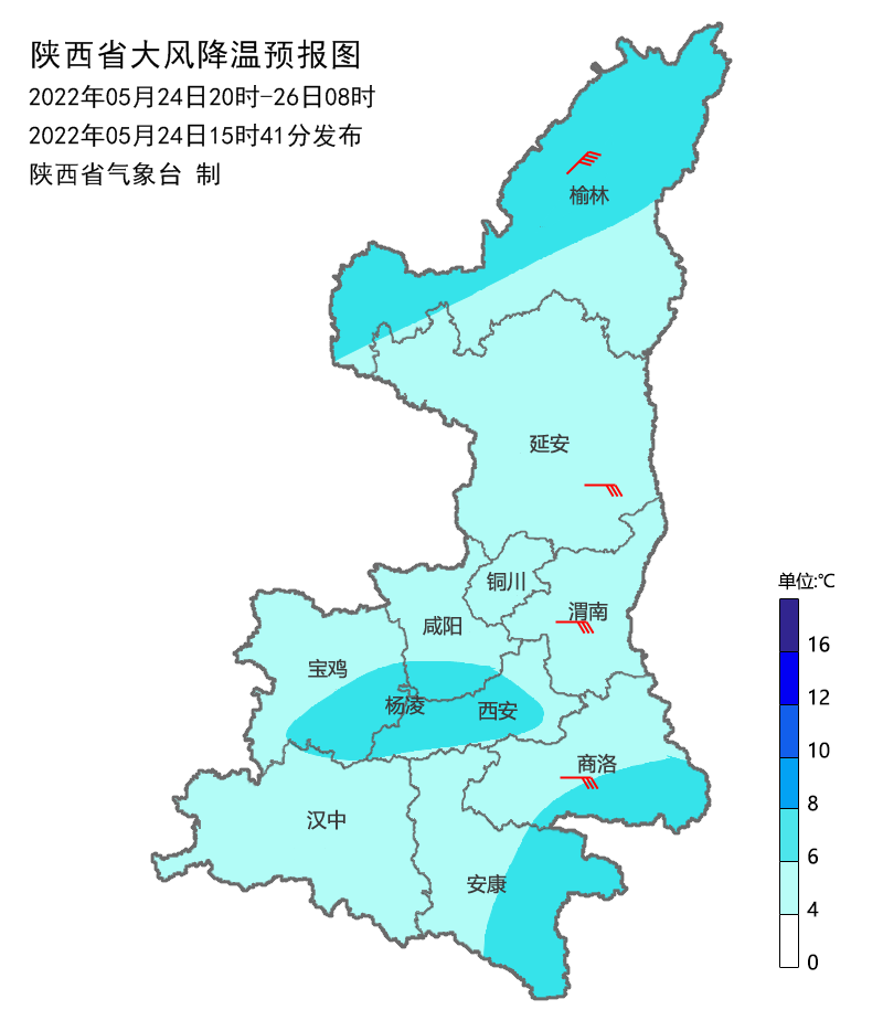 24日晚上到25日白天:陕北北部有5~6级偏北风,阵风可达7~8级;陕北南部、关中东部、商洛有4~5级偏东风,阵风可达6级以上。过程日平均气温自北向南下降4~6℃。
