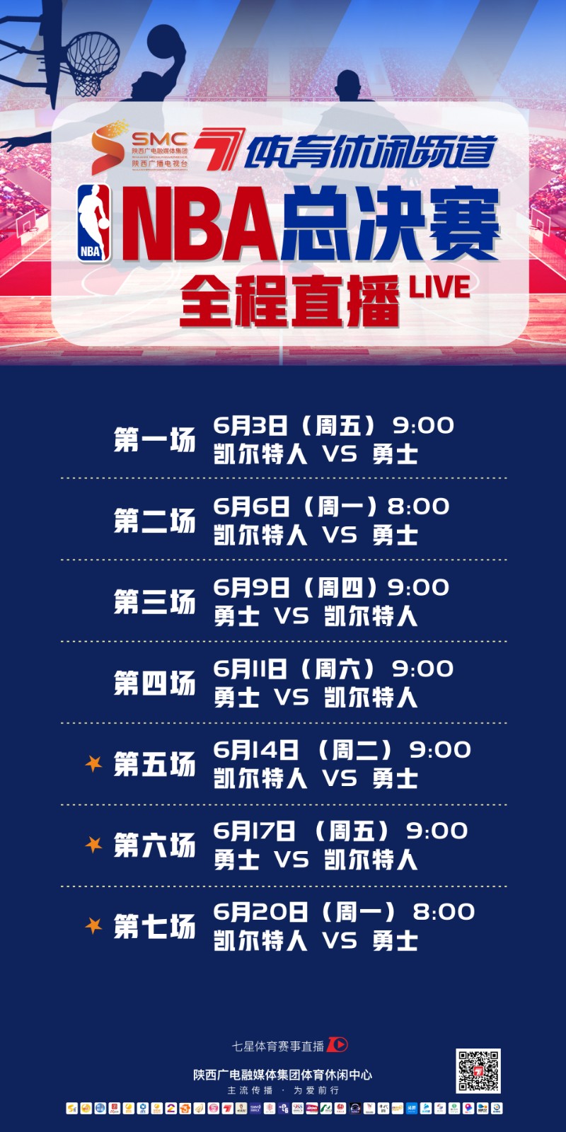 6月3日开始,陕西广电融媒体集团(台)体育休闲频道将全程直播NBA总决赛。届时,陕西广电融媒体集团(台)官方客户端起点新闻也将第一时间为大家呈现总决赛的精彩动态。