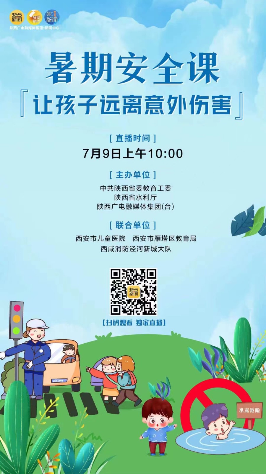 由中共陕西省委教育工委、陕西省水利厅、陕西广电融媒体集团(台)主办,西安市儿童医院、西安市雁塔区教育局、西咸消防泾河新城大队等单位协办的特别节目《暑期安全课:让孩子远离意外伤害》融媒大直播,将邀请西北儿科联盟急救学组组长、西安市儿童医院急诊科主任苏宇飞走进演播室,通过实际案例分析、现场演示、直播连线等方式,为广大师生、家长、网友普及意外事故的预防及应急救援处理知识。敬请关注!