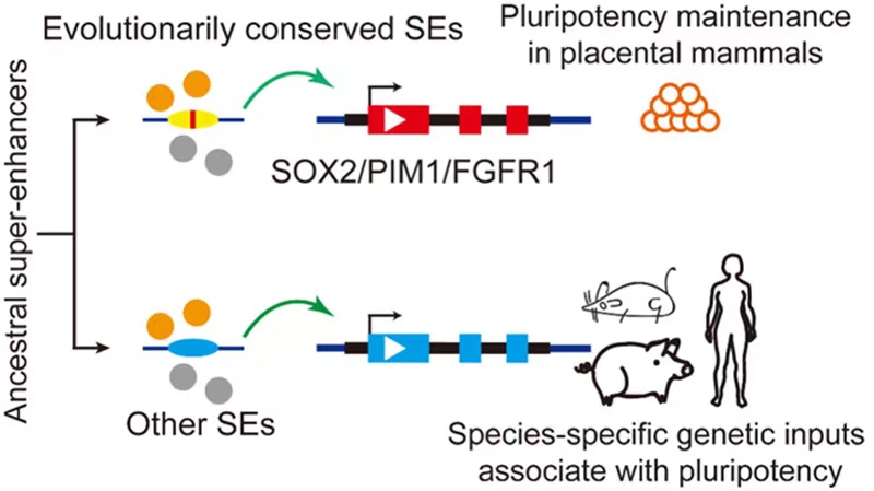 研究表明,超级增强子在哺乳动物中快速进化,并利用基因编辑技术证实SE-SOX2、SE-PIM1、SE-FGFR1是维持胎盘动物干细胞多能性所必须的三个保守性超级增强子。该成果揭示了高度保守的超级增强子在胎盘动物干细胞多能性的维持中发挥了关键作用,而其它与多能性相关超级增强子的变异可能参与物种间多能性调控网络的形成。