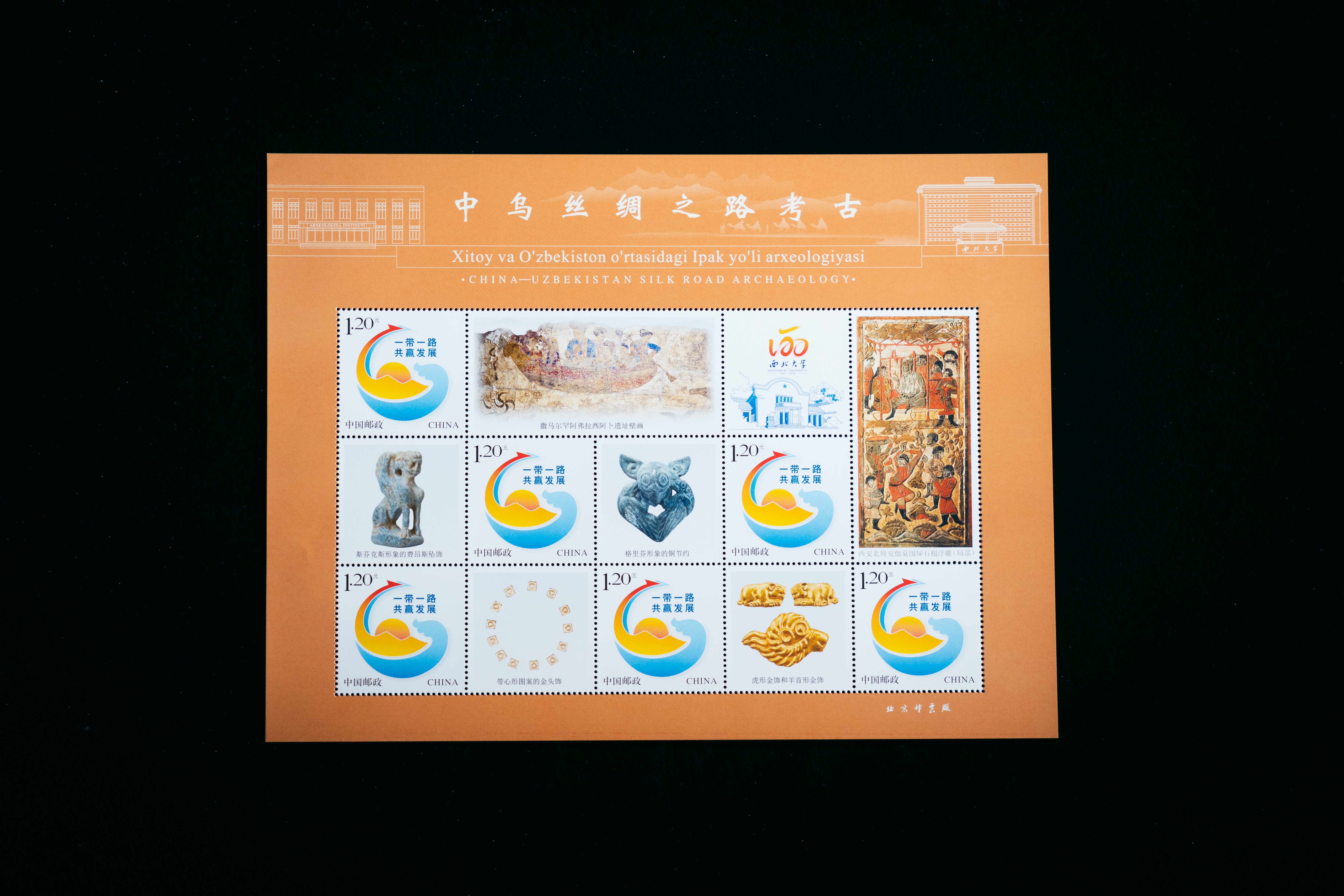 《中乌丝绸之路考古》邮票邮折11月4日在西北大学发行,邮票由乌兹别克斯坦邮政公司发行的7枚邮票,以中国邮政公司发行的6枚《一带一路 共赢发展》个性化邮票共同组成。