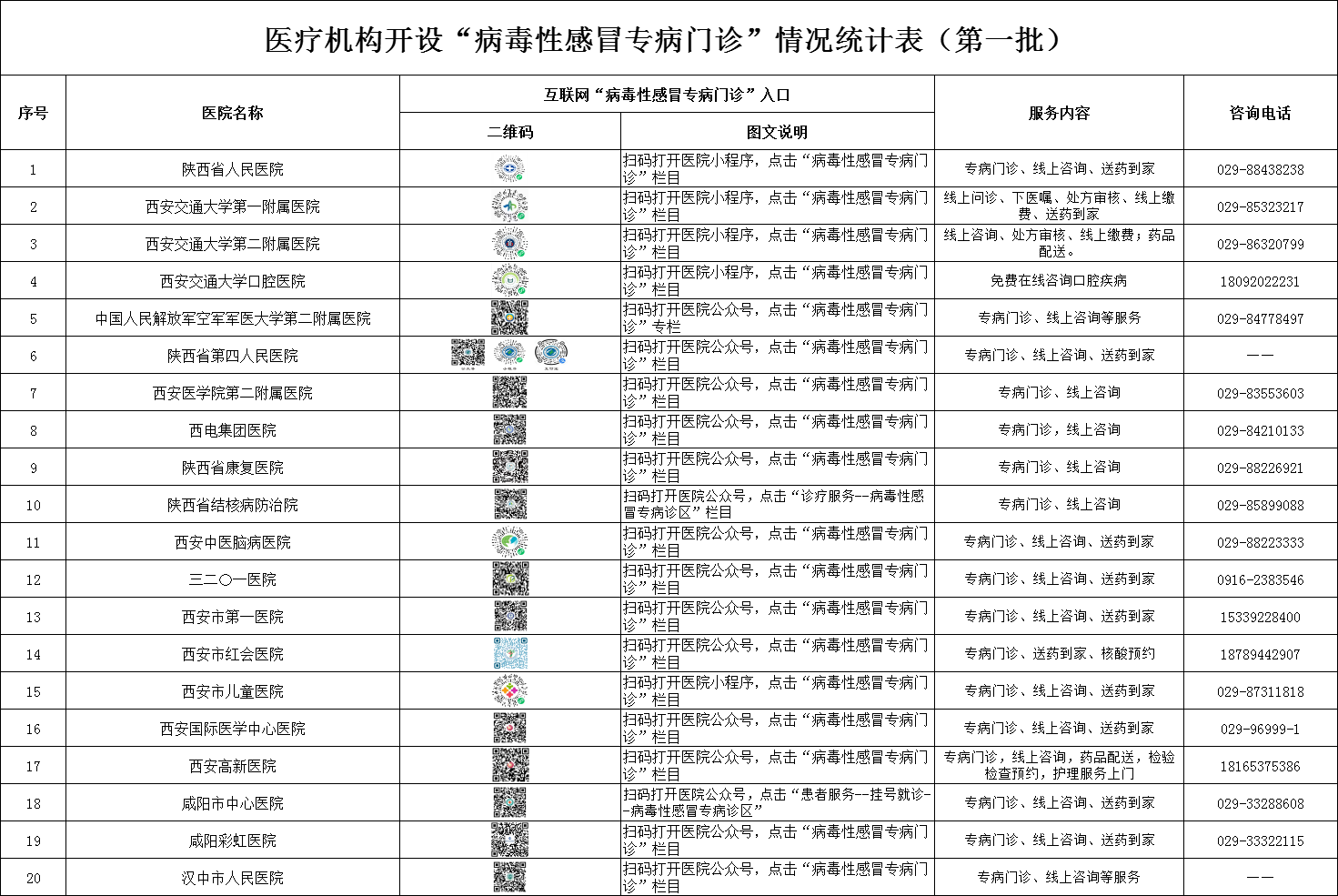 为进一步满足有发热、咳嗽等症状患者线上就医需要,现将陕西省部分医疗机构互联网医院“病毒性感冒专病门诊”线上服务信息整理并公布如下: