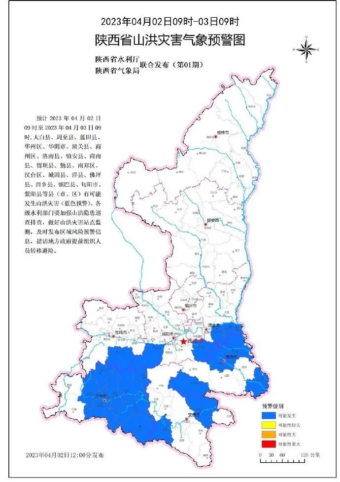 预计2023年04月02日09时至2023年04月03日09时,太白县、周至县、蓝田县、华州区、华阴市、潼关县、商州区、洛南县、镇安县、商南县、留坝县、勉县、南郑区、汉台区、城固县、洋县、佛坪县、西乡县、镇巴县、旬阳市、紫阳县等县(市、区)有可能发生山洪灾害(蓝色预警)。各级水利部门要加强山洪隐患巡查排查,做好山洪灾害站点监测,及时发布区域风险预警信息,提请地方政府提前组织人员转移避险。