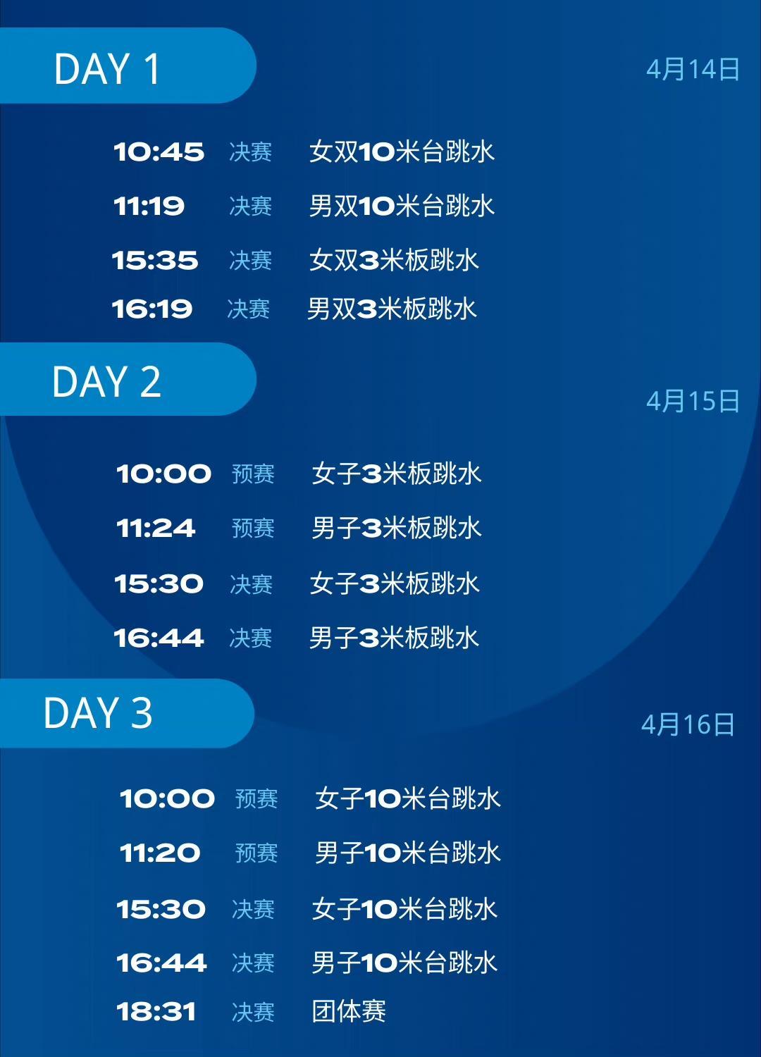 世界泳联公布的赛程显示,4月14日从上午到下午分别进行女子双人10米台、男子双人10米台、女子双人3米板、男子双人3米板项目决赛,4月15日上午进行女子单人3米板、男子单人3米板预赛,下午进行女子单人3米板以及男子单人3米板决赛,4月16日上午进行女子单人10米台、男子单人10米台预赛,下午进行女子单人10米台、男子单人10米台决赛,晚间进行混合团体赛决赛。