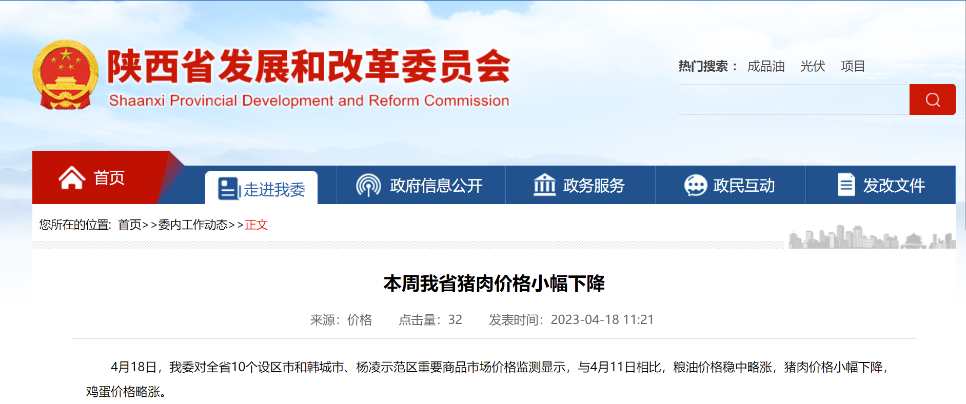 4月18日,陕西省发改委对陕西省10个设区市和韩城市、杨凌示范区重要商品市场价格监测显示,与4月11日相比,粮油价格稳中略涨,猪肉价格小幅下降,鸡蛋价格略涨。