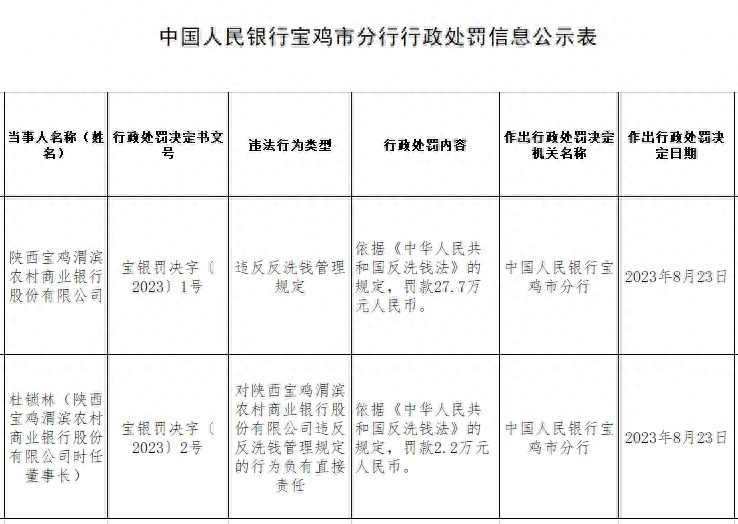 近日,中国人民银行宝鸡市分行对陕西宝鸡渭滨农村商业银行股份有限公司(以下简称“宝鸡渭滨农商银行”)进行了处罚,原因是该银行违反了《中华人民共和国反洗钱法》的相关规定。根据处罚决定,宝鸡渭滨农商银行将被罚款27.7万元人民币。