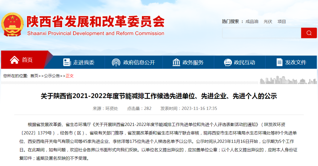 近日,陕西省发展和改革委员会官网发布《关于陕西省2021-2022年度节能减排工作候选先进单位、先进企业、先进个人的公示》,经各市(区)、省级有关部门推荐,省发展改革委和省生态环境厅联合审核,现将西安市生态环境局水生态环境处等89个先进单位、西安西电开关电气有限公司等45家先进企业、李林洋等175位先进个人候选名单予以公示。具体公示如下: