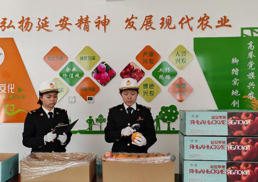 西安海关所属延安海关关员对出口苹果进行检查(西安海关供图)