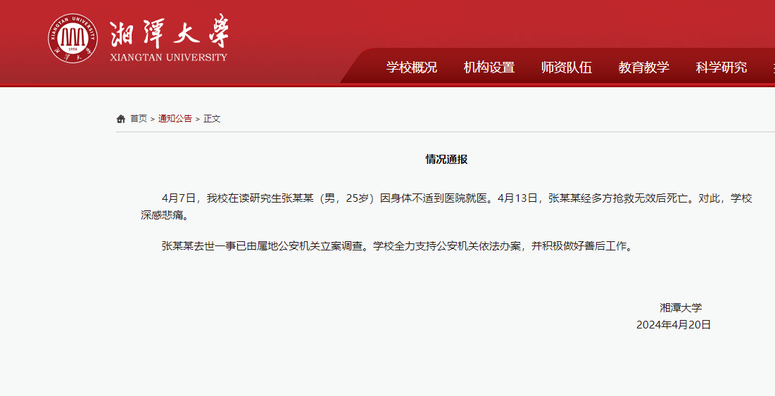 据湘潭大学官网消息,4月7日,我校在读研究生张某某(男,25岁)因身体不适到医院就医。4月13日,张某某经多方抢救无效后死亡。对此,学校深感悲痛。