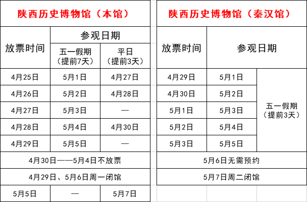 陕西历史博物馆、陕西历史博物馆秦汉馆五一期间均正常开放。陕历博本馆放票时间“五一”假期是提前7天、平日是提前3天,陕历博秦汉馆“五一”假期放票时间是提前3天。