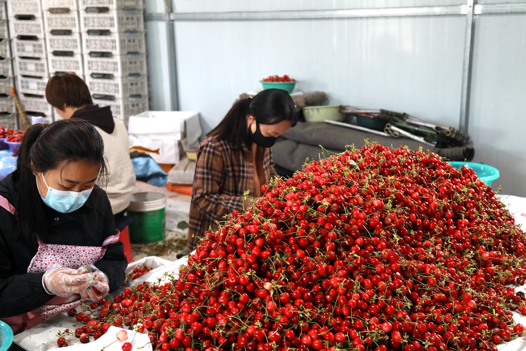 村民将刚刚采摘的樱桃送到庄头镇永成现代农业种植有限公司,由工人按照不同的大小规格进行分选包装,之后发往四川、江苏、东北等地,走上当地消费者的餐桌。