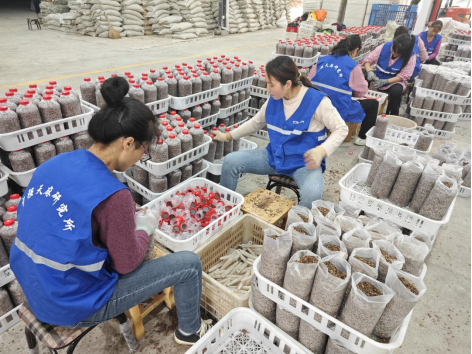图为天麻菌种装袋现场