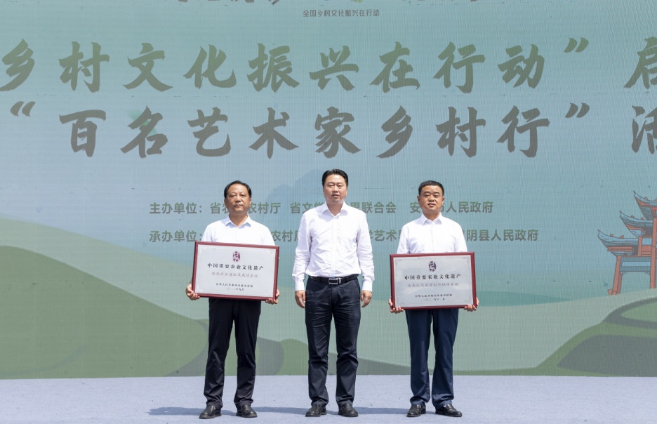 活动还为府谷海红果栽培系统、汉阴凤堰稻作梯田系统荣获“中国重要农业文化遗产”进行授牌,为“百名艺术家乡村行”进行授旗。艺术家代表为本次活动书写主题词,现场表演了舞蹈、歌曲、朗诵等精彩的节目。