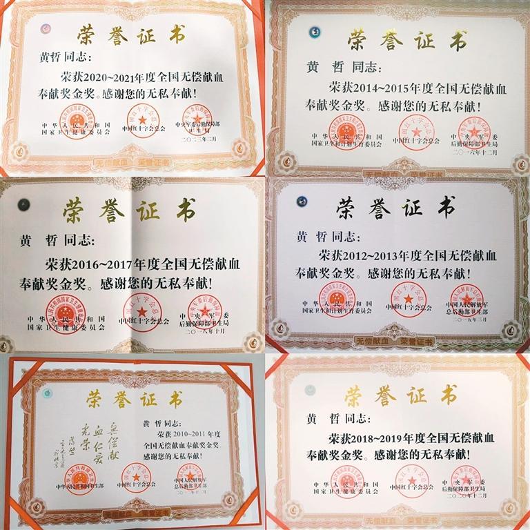 2015年他荣获西安市无偿献血形象大使选拔赛最佳人气奖,被评为无偿献血优秀志愿者;2018年获全国无偿献血促进奖个人奖;2019年入选《全国无偿献血群英谱》。黄哲曾连续7次荣获“全国无偿献血奉献奖金奖”,2022年荣获无偿献血终身荣誉奖。这满满的证书和荣誉写满了这位年过半百的医生对奉献爱心的坚持与执着。