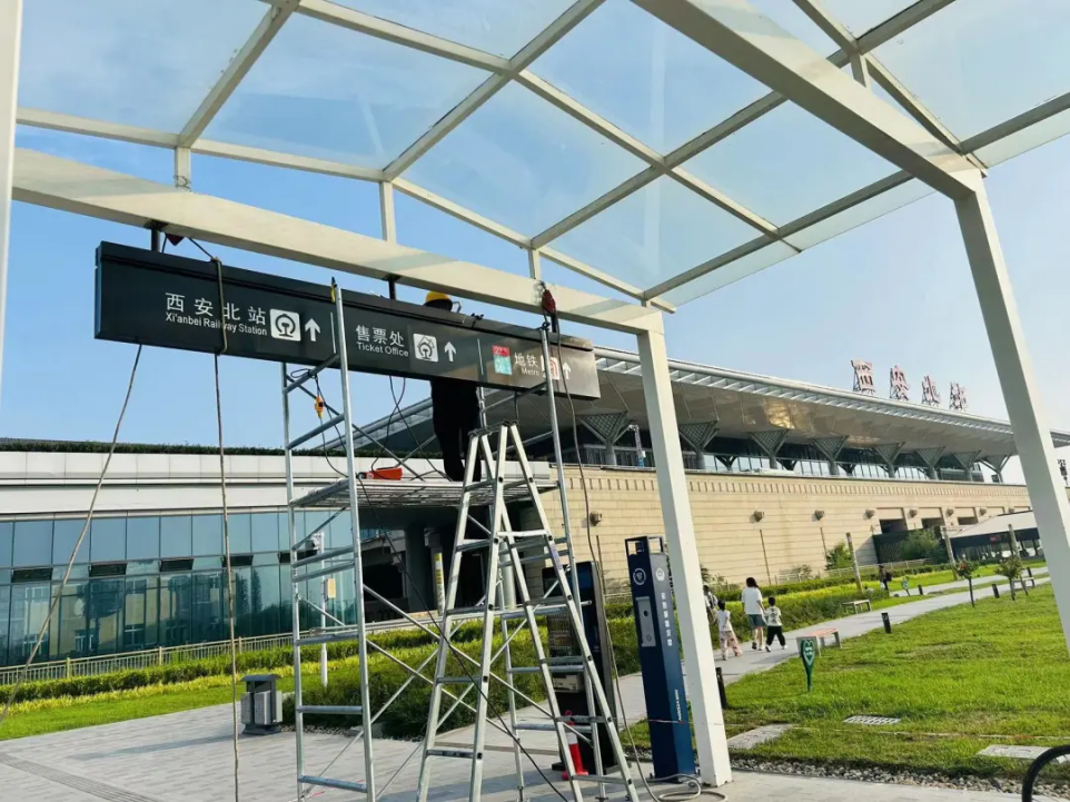 此次更新提升项目不仅限于新增标识系统,还对原有标识标牌进行了全面翻新制作,对内容进行了校对更正,部分新增标识标牌与翻新后标识标牌保持统一材质和工艺,共涉及52处,268块。其中,南广场有12处立柱,67块指示牌;北广场有5处立柱,25块指示牌;风雨连廊吊牌有5处5块;东贵宾通道有5处立柱,28块指示牌;元朔大道、建元路、秦汉大道等周边道路有25处立柱,143块指示牌。这些标识标牌为站区增添了新的风景线,极大地提升了旅客的出行效率与满意度。