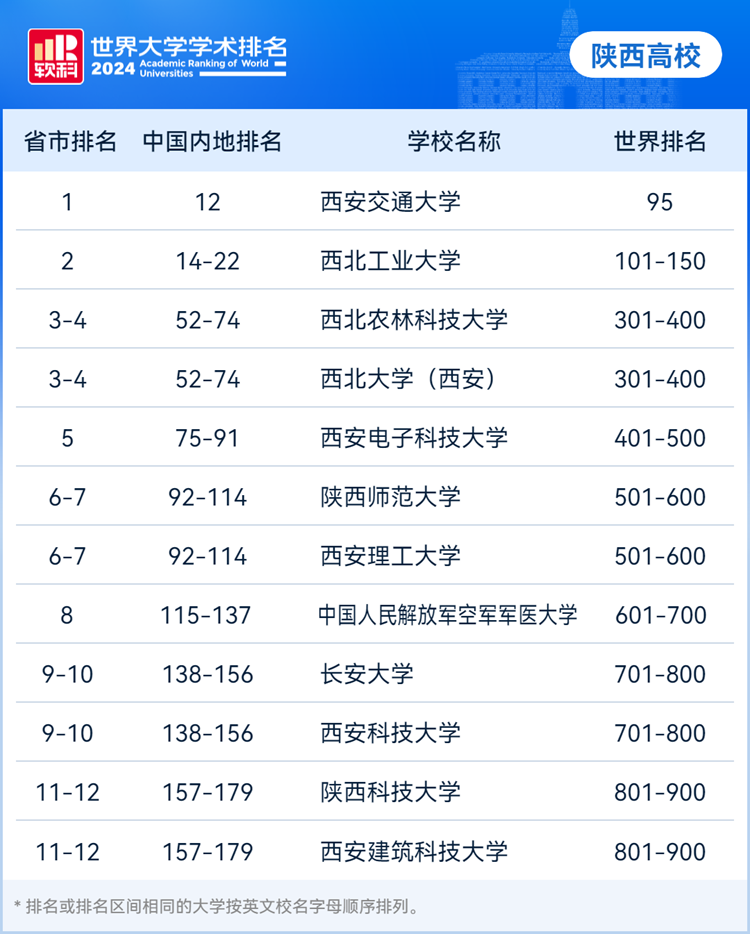 ☛其余上榜的陕西高校还有陕西师范大学、西安理工大学、空军军医大学、长安大学、西安科技大学、陕西科技大学和西安建筑科技大学。