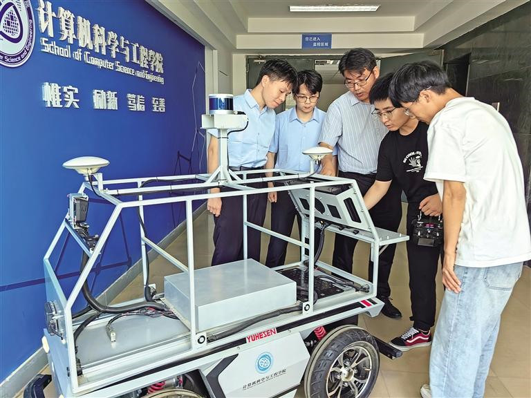 西安理工大学宋霄罡副教授团队针对复杂施工场景采用人工智能、计算机视觉等技术实现施工质量无人监管与智能安全预警,实现绿色施工、智能决策、科学管理。图为宋霄罡(左三)带领学生检测设备。 通讯员 李博摄