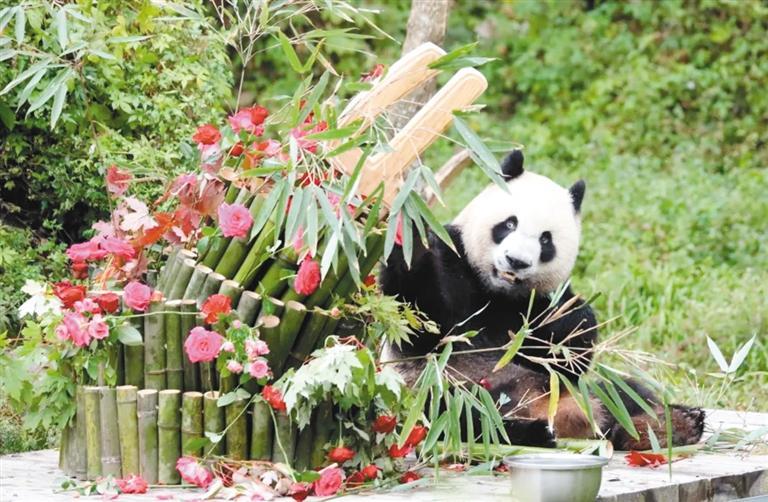 “秦华”生日当天,保育员为它准备了一个用竹子、竹筒、月季花和红枫叶做成的特殊“生日蛋糕”。它爱吃的苹果、胡萝卜和盆盆奶等食物放在蛋糕周围。“秦华”悠闲享用完食物后立马显示出爱“拆家”的一面,不仅把蛋糕拉得东倒西歪,还拆掉了竹椅靠背,憨憨萌萌的样子非常有趣。