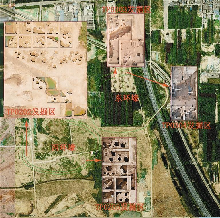 在发掘现场,王小庆介绍,遗址发现体量巨大的两个环壕、形式多样的房屋建筑、密集分布的大型袋状灰坑及少量墓葬、祭祀遗存和手工业遗存。
