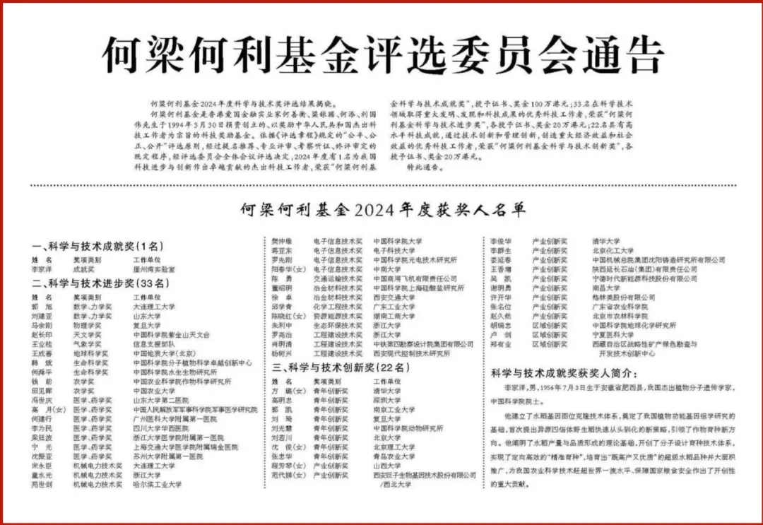 依据《评选章程》规定的“公平、公正、公开”评选原则,经过提名推荐、专业评审、考察听证、终评审定的既定程序,经评选委员会全体会议评选决定,2024年度有1名为我国科技进步与创新作出卓越贡献的杰出科技工作者,荣获“何梁何利基金科学与技术成就奖”,授予证书、奖金100万港元;33名在科学技术领域取得重大发明、发现和科技成果的优秀科技工作者,荣获“何梁何利基金科学与技术进步奖”,各授予证书、奖金20万港元;22名具有高水平科技成就,通过技术创新和管理创新,创造重大经济效益和社会效益的优秀科技工作者,荣获“何梁何利基金科学与技术创新奖”,各授予证书、奖金20万港元。