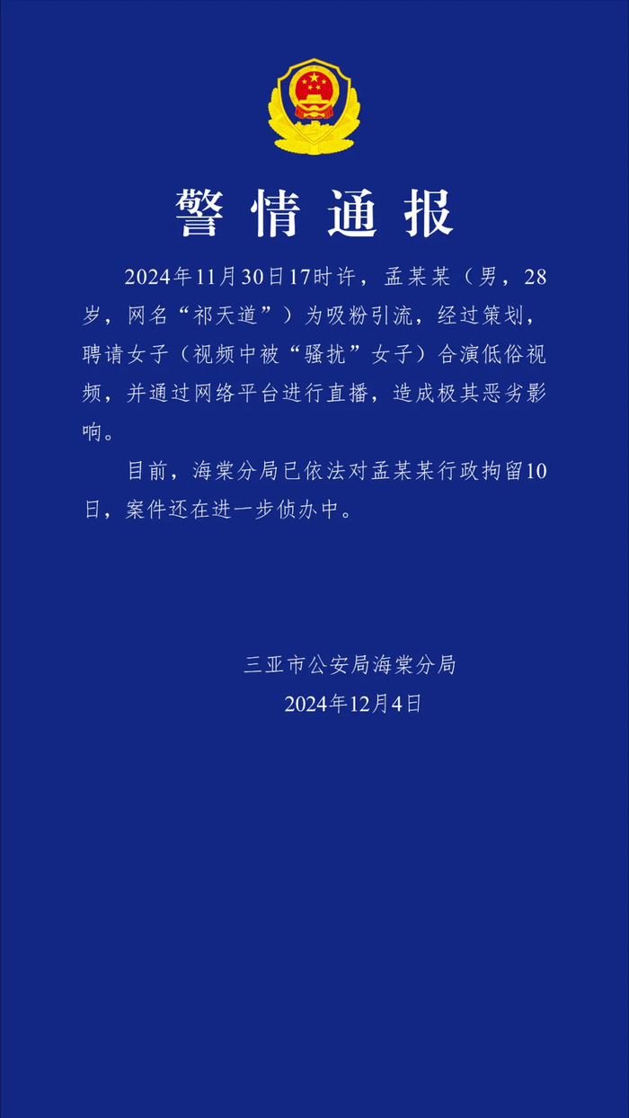 三亚市公安局海棠分局12月4日通报:11月30日17时许,孟某某(男,28岁,网名“祁天道”)为吸粉引流,经过策划,聘请女子(视频中被“骚扰”女子)合演低俗视频,并通过网络平台进行直播,造成极其恶劣影响。