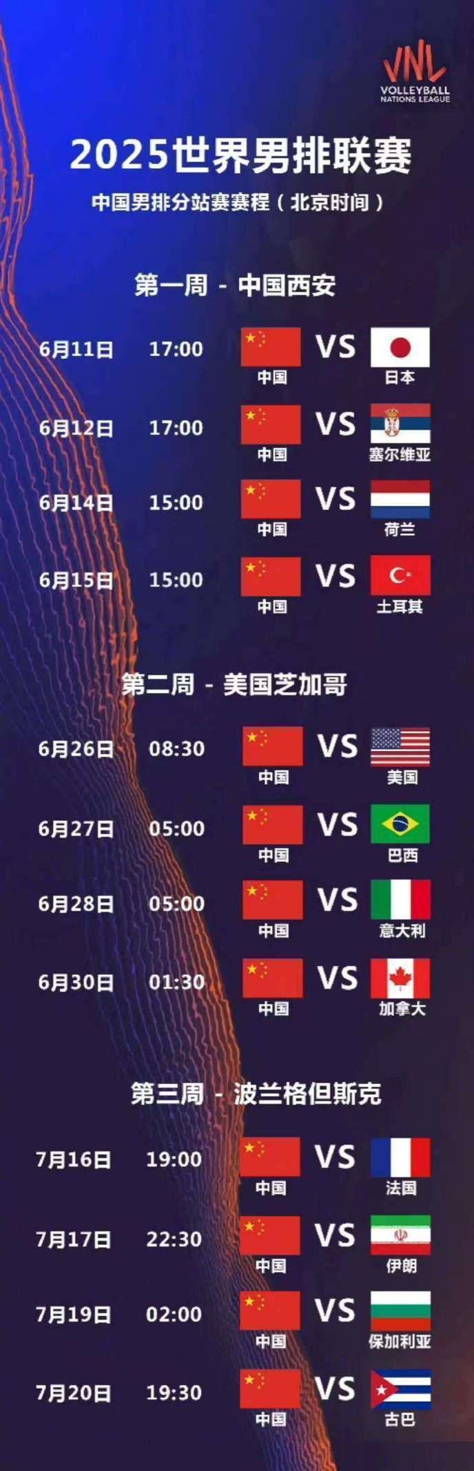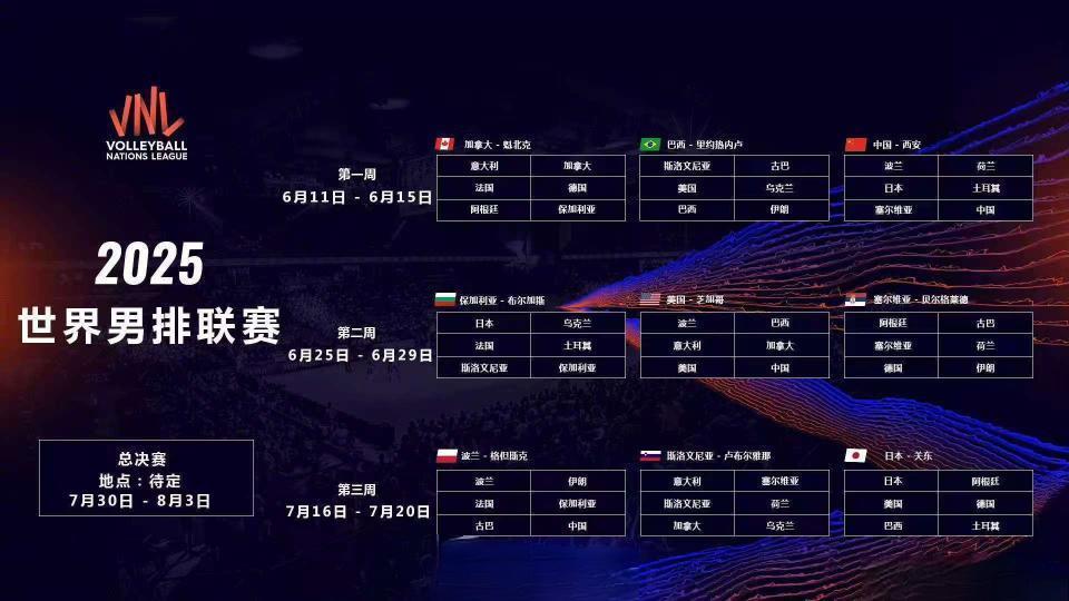 据了解,国际排联对2025年世界排球联赛进行了改革,男排和女排参赛队伍从原来的16支增加到18支,男女排每支球队都将在三站小组赛里打12场比赛,最终由积分排名靠前的球队参加决赛,而决赛阶段比赛将于明年7月底至8月初举行,具体的举办地点尚未确定。国际排联于12月10日公布的2025年世界排球联赛的相关信息中,关于举办城市、小组赛分组情况、球队赛程等资料非常详尽。中国的北京和西安将分别承办女排和男排联赛首站比赛,而新赛季男排联赛将于2025年6月11日至15日,在魁北克城、里约热内卢和西安拉开战幕。