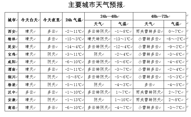 23日:陕北、关中多云转阴天,陕南阴天,陕北南部部分地方、关中大部和陕南大部有小雪或雨夹雪。