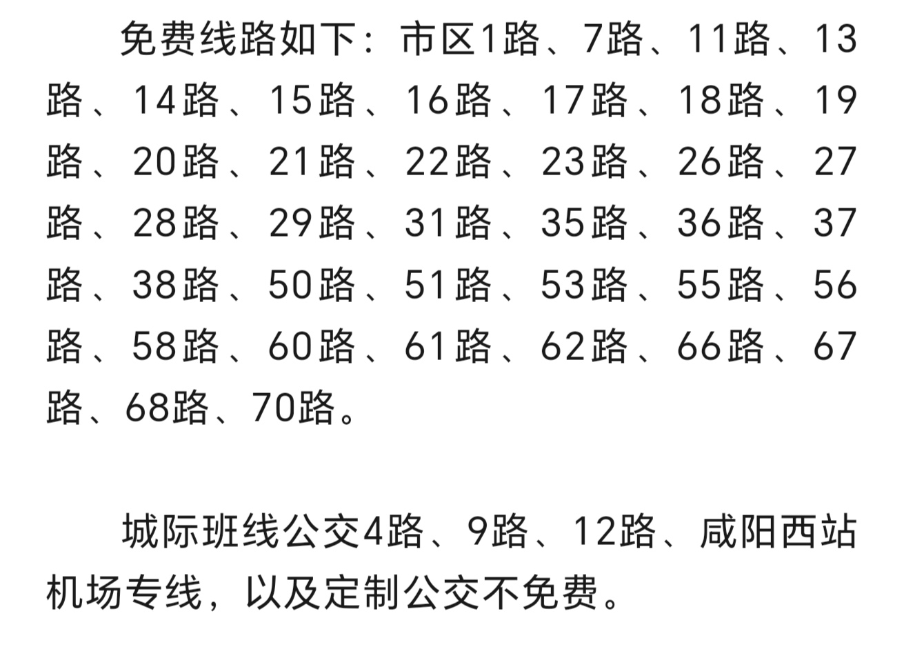 2024年12月23日至12月31日,咸阳市启动重污染天气红色预警和Ⅰ级应急响应。咸阳市公交集团按照《重污染天气下公交运力保障应急预案》,12月23日零时起市区36条公交线路,共700余辆公交车实施免费乘坐。注意:城际班线公交4路、9路、12路、咸阳西站机场专线,以及定制公交不免费。