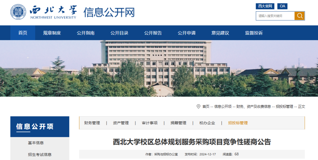 11月8日,西北大学发布采购意向,计划在12月进行《西北大学校区总体规划》的采购,进行西北大学校区总体规划的编制,完成校区城市设计和修建性详细规划设计。