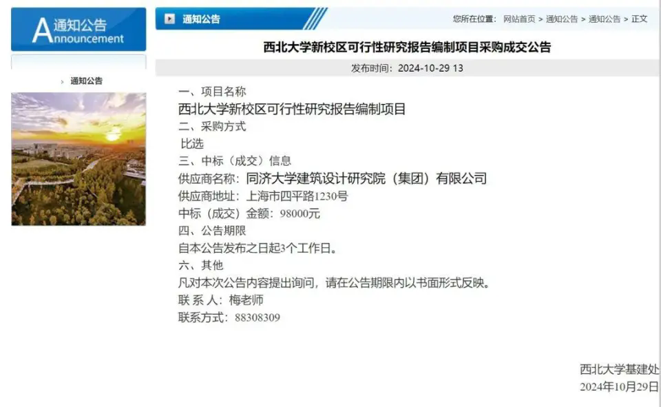10月29日,西北大学发布《西北大学新校区可行性研究报告编制项目采购成交公告》,正式公布由同济大学建筑设计研究院(集团)有限公司中标。