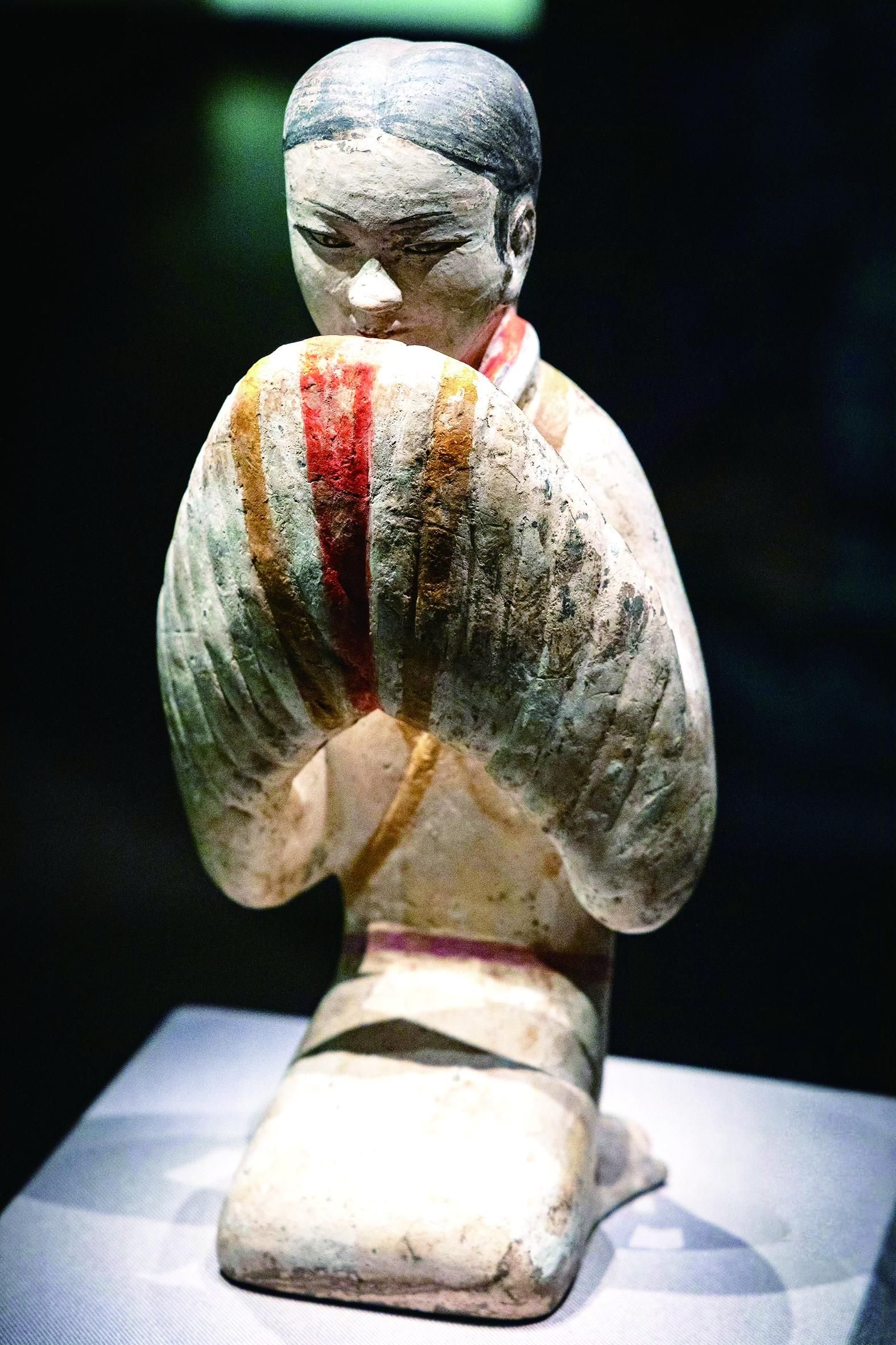 西汉塑衣式彩绘拱手跽坐女俑。 本报记者 赵争耀 摄