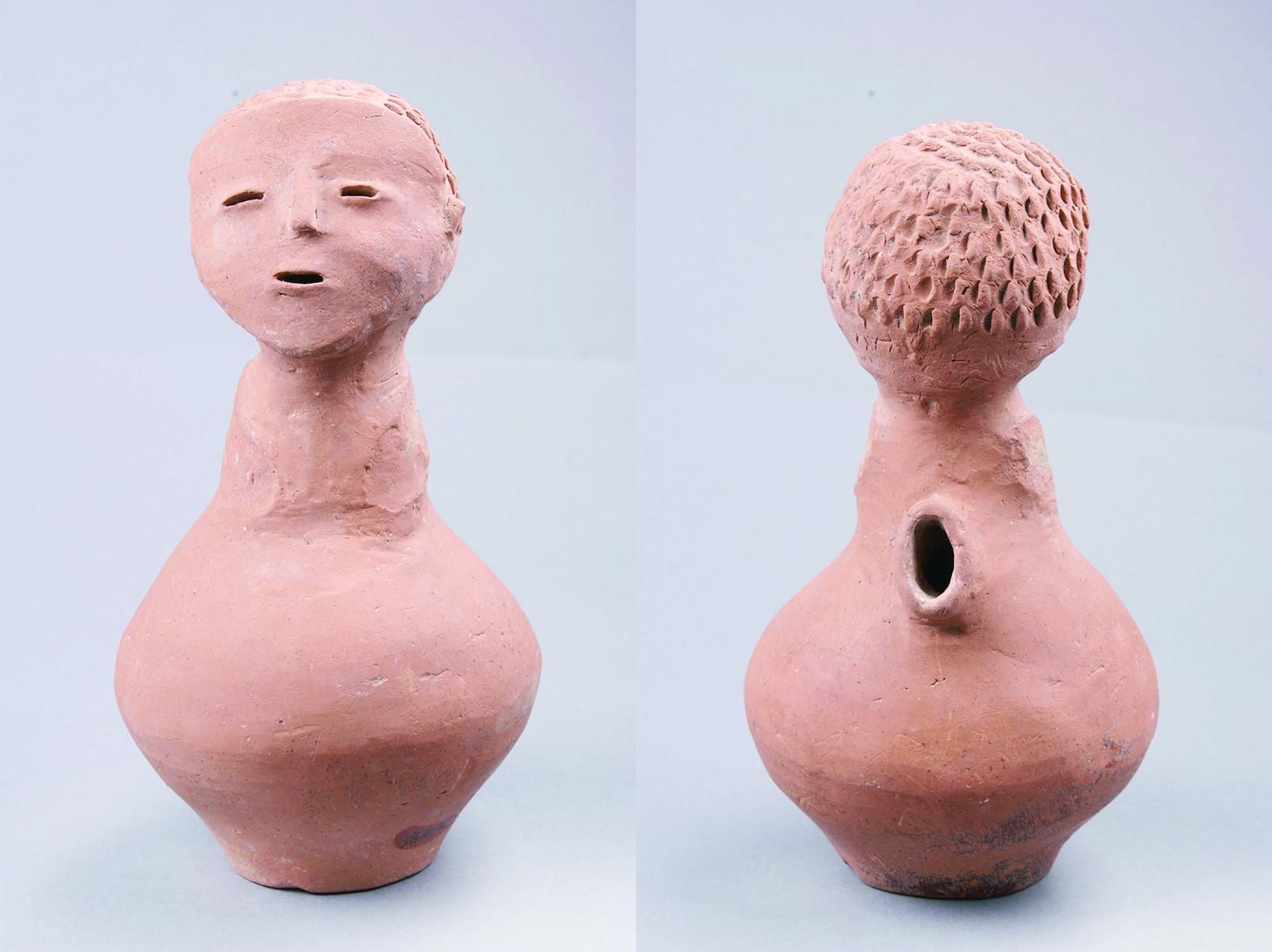 红陶人头壶出土于商洛市洛南县灵口镇焦村遗址,是1953年当地村民在修建公房时发现的,整件文物高23厘米,底径6.3厘米,壶体使用原始红陶烧制而成,可以看到脖颈以上的“人头”部分是由工匠手捏而成,其下的壶部分应该是用泥条盘筑法制成。人头部分与壶身浑然一体,人头似微微仰望,面部柔和,嘴角微翘,似乎在微微一笑。陶壶整体呈高颈、鼓腹、小平底形状,鼻梁修长,头顶发型乍一看像目前流行的“羊毛卷”。人头壶由仰韶文化先民制作而成,造型古拙、手法简练,艺术价值极高,是陶塑艺术的启蒙作品,也是仰韶文化的“活化石”。
