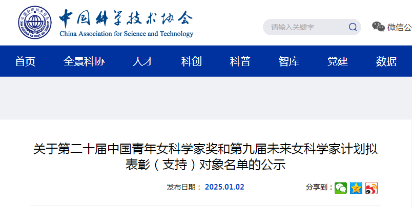 1月2日,中国科协官网发布《关于第二十届中国青年女科学家奖和第九届未来女科学家计划拟表彰(支持)对象名单的公示》。经评审,共产生第二十届中国青年女科学家奖19名拟表彰人选、5个拟表彰团队和10名第九届未来女科学家计划拟支持对象,其中,陕西共2人入选。