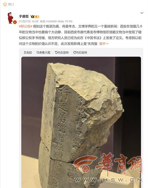 他在微博中说:“在过去的三年中,柳公权书法作品西安陆续被发现,例如《杨承和神道碑》、严公贶墓志,如果这篇文章的推测能成立,就是‘连中三元’,西安将再添一件重量级文物!”