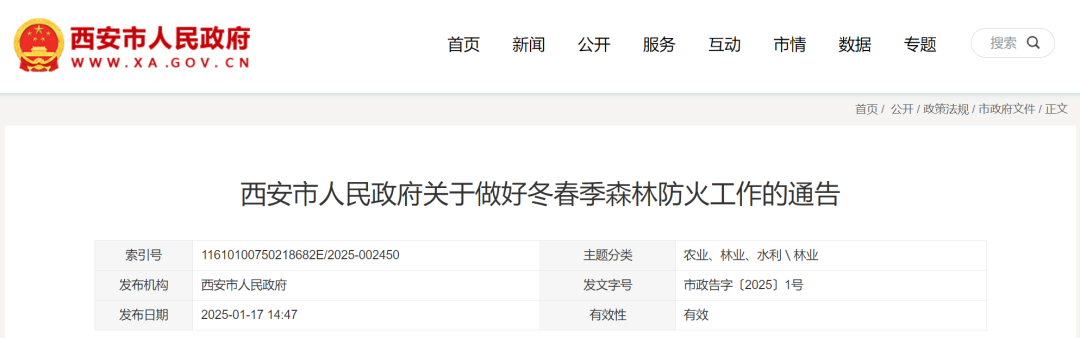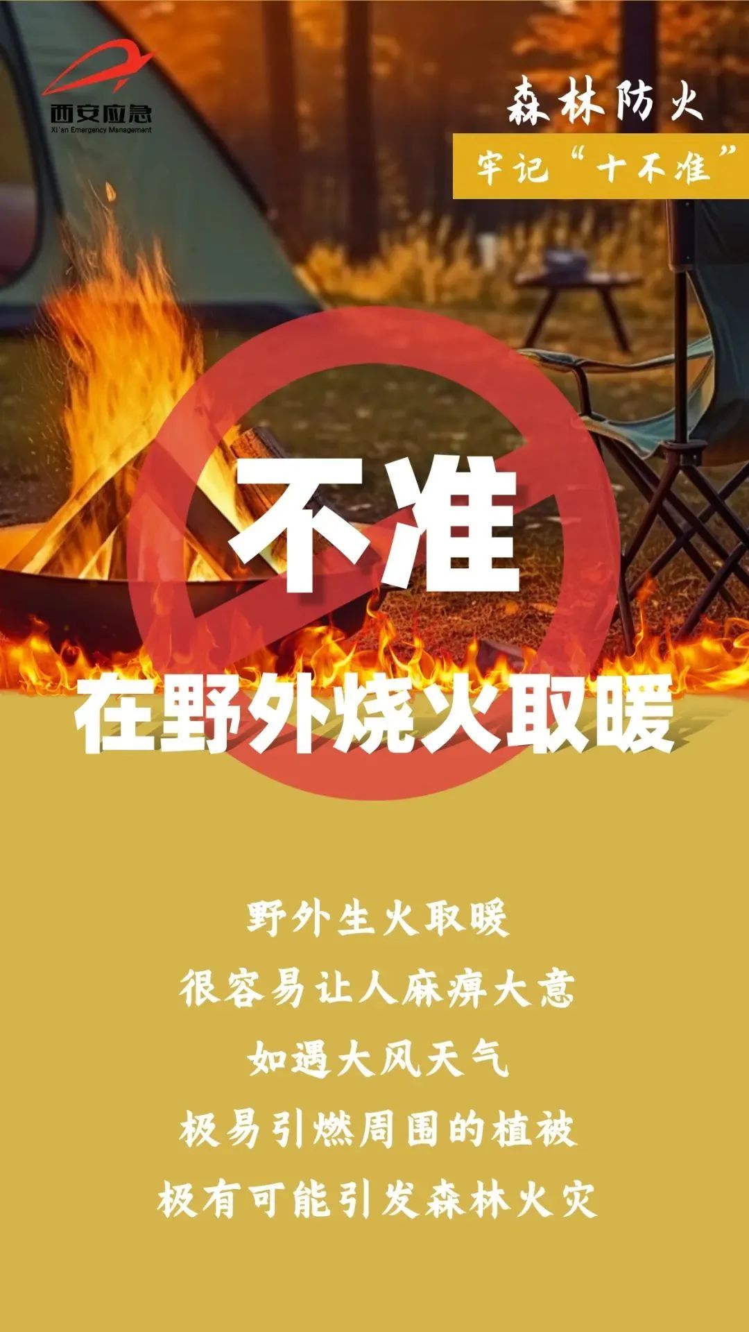 1月17日,西安市人民政府网站发布《关于做好冬春季森林防火工作的通告》。通告要求:严禁个人携带火种进山入林,严禁在野外玩火弄火、私烧乱点、烧荒烧地边、焚烧农作物、焚烧垃圾、烧火做饭、吸烟、乱扔烟头等。