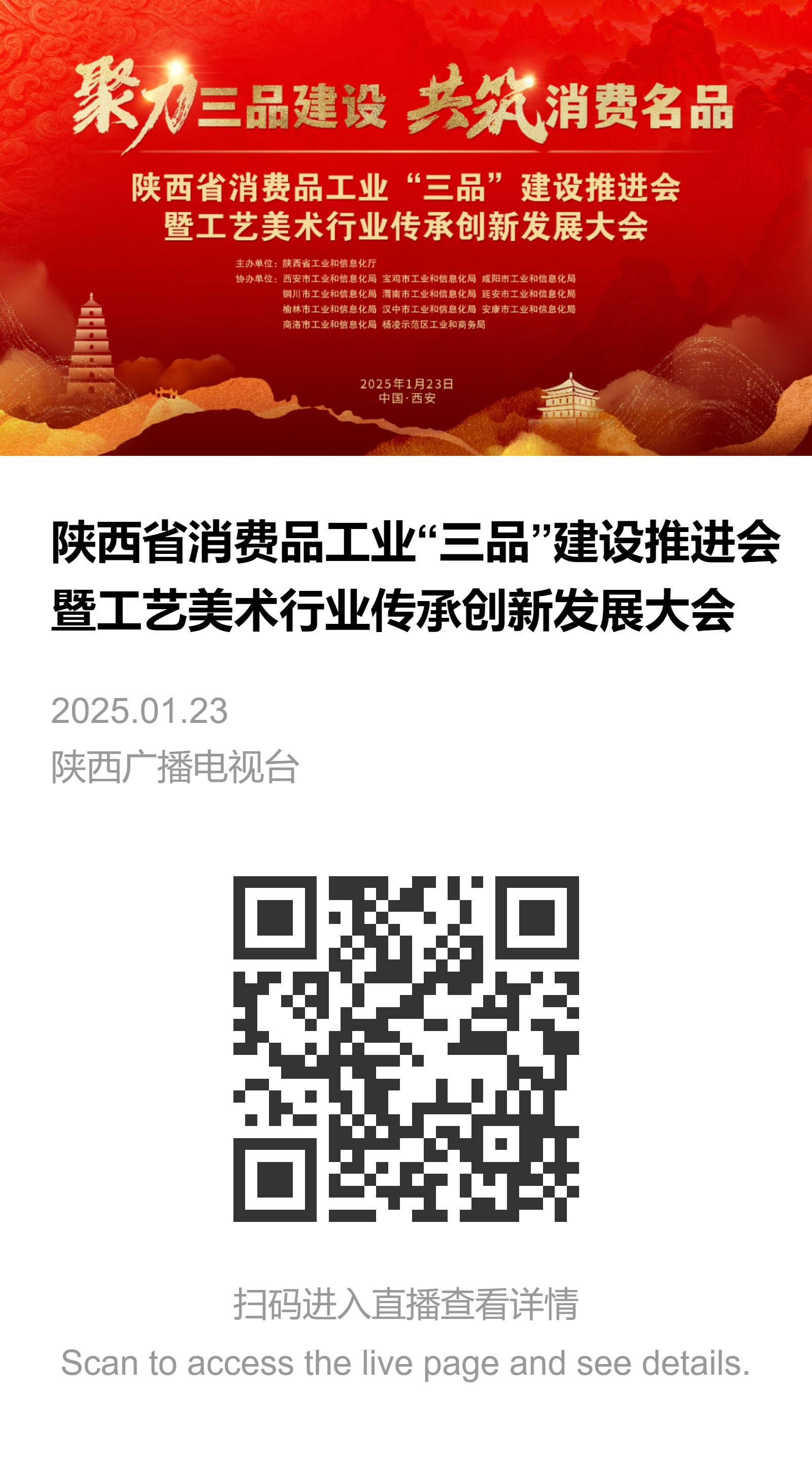图片直播|陕西省消费品工业“三品”建设推进会暨工艺美术行业传承创新发展大会 陕西广电融媒体集团·起点新闻 01-26 14:42 点击上方图片或扫描二维码进入陕西省消费品工业“三品”建设推进会暨工艺美术行业传承创新发展大会图片直播 编辑:石永波