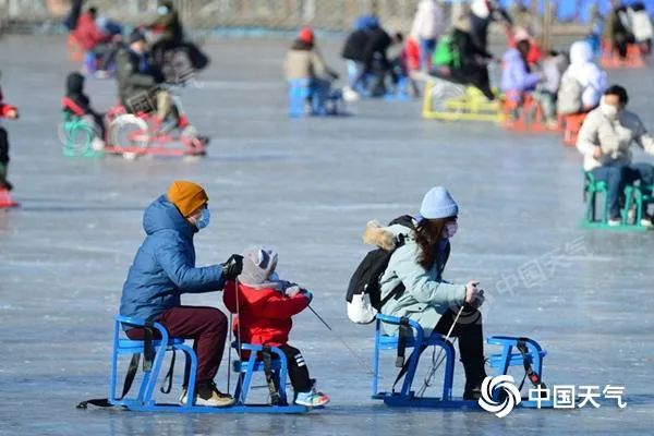 在什刹海冰场,人们划冰车体验冰趣。
