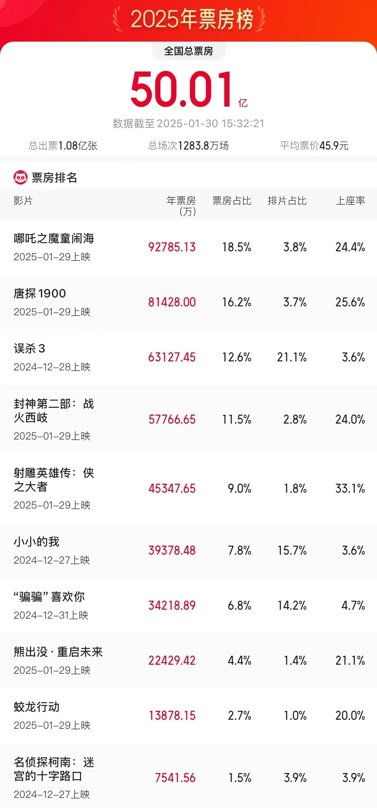 《哪吒之魔童闹海》暂列年度票房榜首位