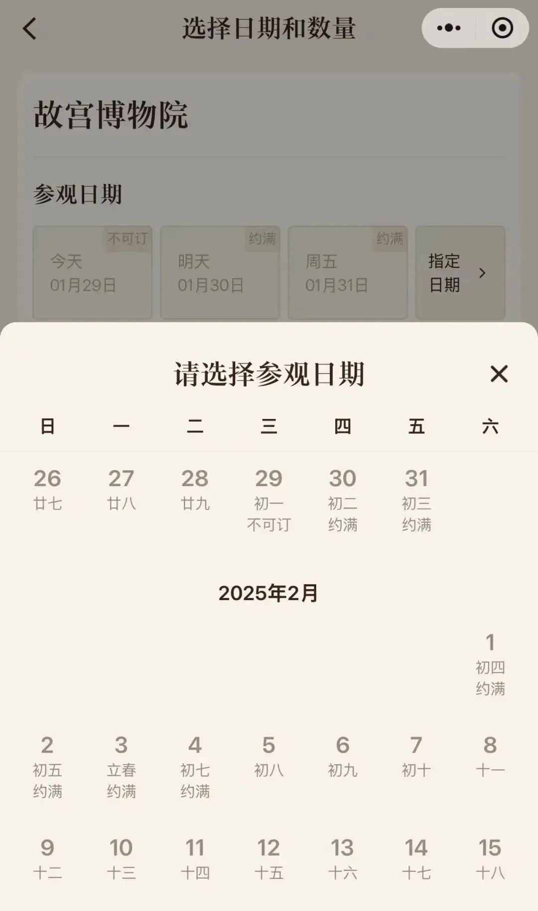 1.故宫博物院初一直到初七的门票全部约满售罄。