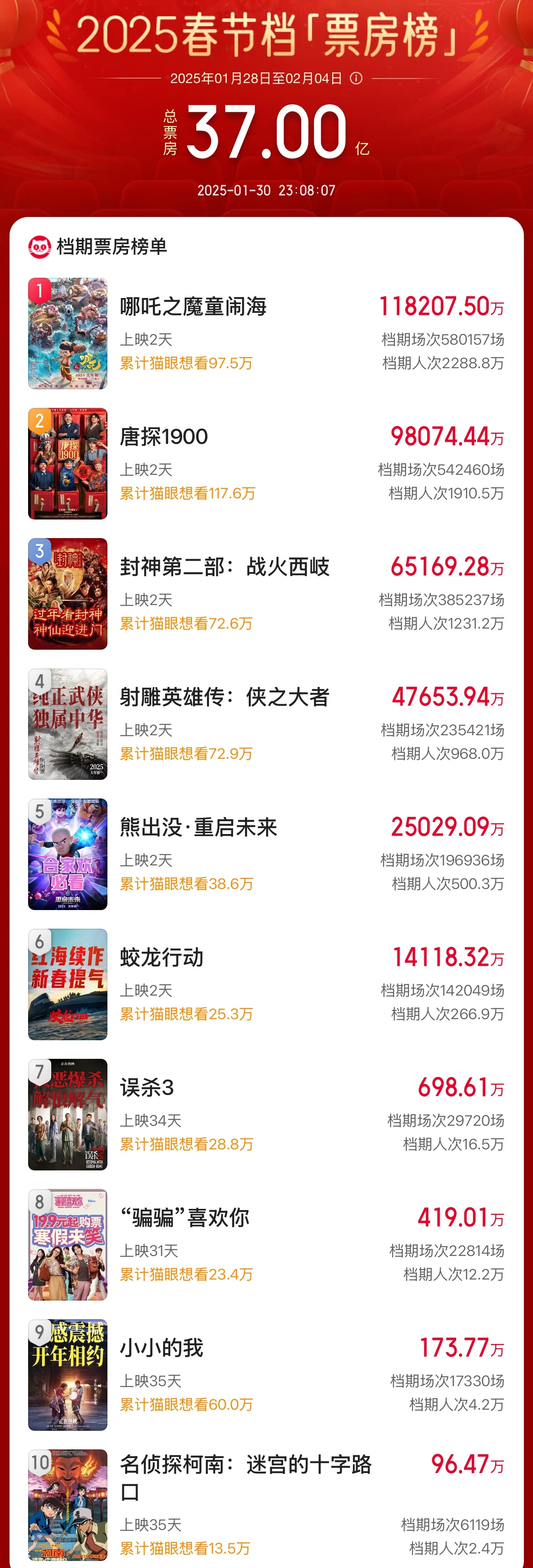 2025春节档总票房(含预售)破37亿