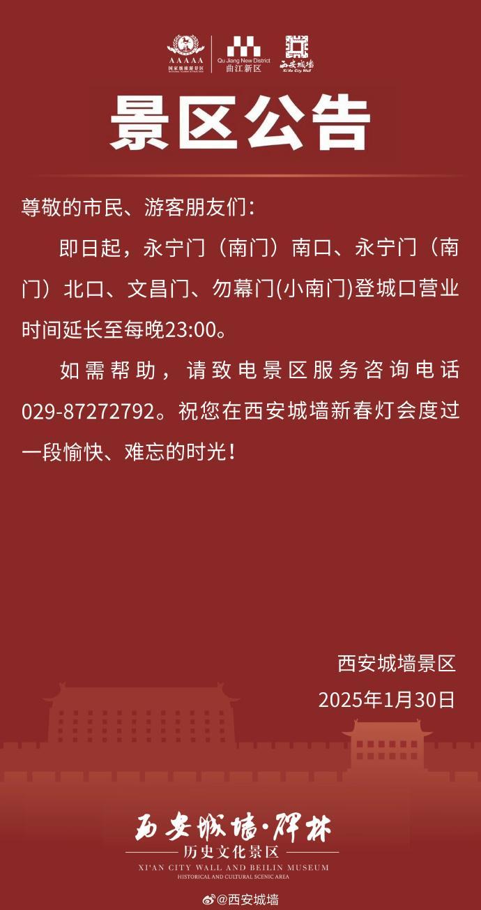 即日起,永宁门(南门)南口、永宁门(南门)北口、文昌门、勿幕门(小南门)登城口营业时间延长至每晚23:00。