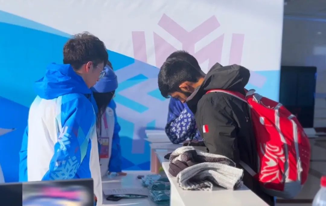穿过以亚冬会为主题的书画作品,就能来到公共媒体工作间,据工作人员介绍,今天正式运行工作间就迎来了第一位到访的外媒记者,来自巴林的摄影记者,在工作人员的引导下,顺利取到工作间音频耳机及转换插头等物资,志愿者热情专业的服务也得到了他的充分认可。