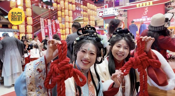 大年初四早上,在西安市钟楼附近的某汉服体验街区,一场精彩的春节民俗活动正在进行,一群外国人身着汉服,沉浸其中,体验着浓浓的“年味”。
