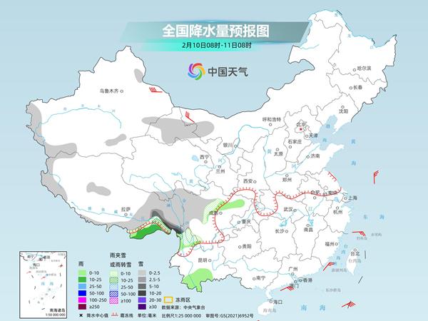 明天,内蒙古西部、甘肃西部、西藏东部、川西高原、云南西北部等地部分地区有小到中雪或雨夹雪,其中,西藏东南部等地部分地区有大到暴雪。西藏东南部、云南南部等地部分地区有小到中雨。
