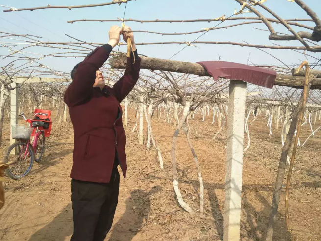检查果园棚架、立杆、地锚以及架面枝条等是否出现松动情况,及时加固维修。未绑枝的果园进行绑枝。