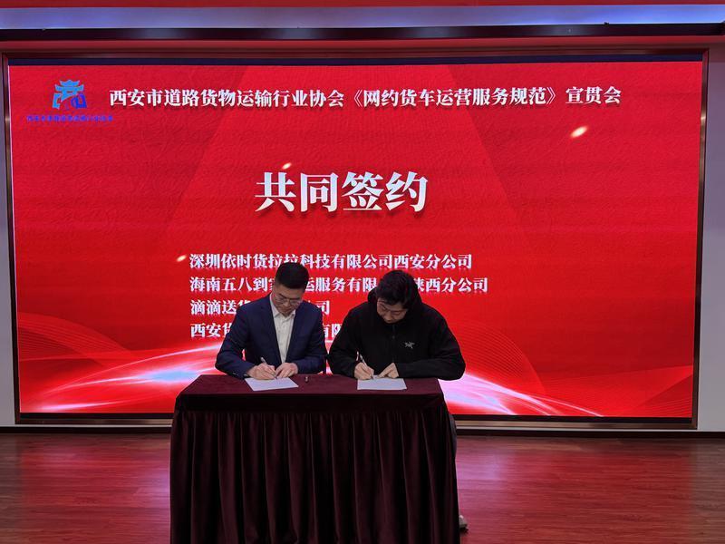 当天,西安市道路货物运输行业协会召开《规范》宣贯会,深圳依时货拉拉科技有限公司西安分公司、海南五八到家货运服务有限公司陕西分公司、滴滴送货西安分公司、西安货达网络科技有限公司共同签署《规范》实施协议。